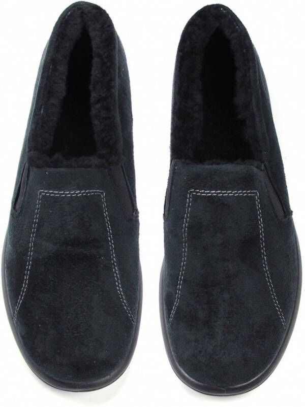 Zwart suède pantoffel met subtiele sleehak voor dames van het merk Rohde. Deze sloffen zijn gemaakt van suède met elastiek aan weerszijden om het aan- en uittrekken te versoepelen. Zowel de binnenvoering als het voetbed bestaan uit vacht. De buitenzool is van rubber en de kleine sleehak meet circa 4 cm.