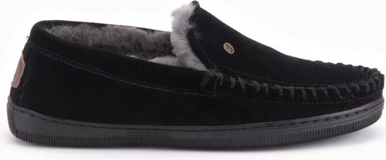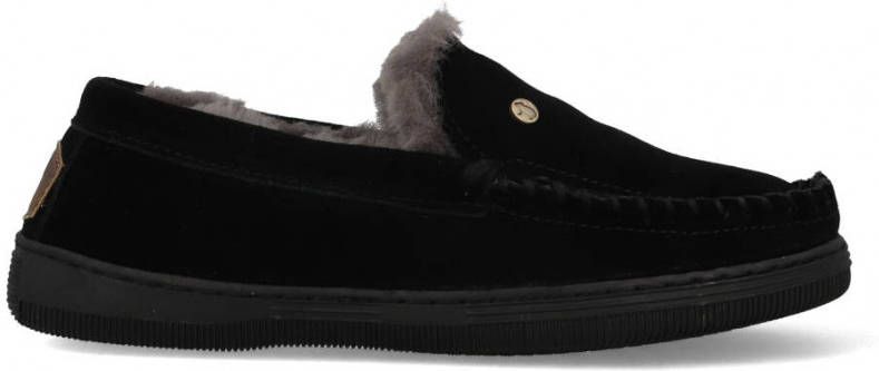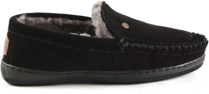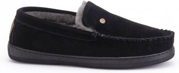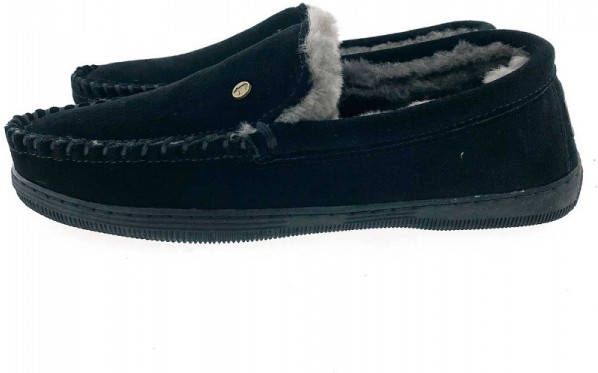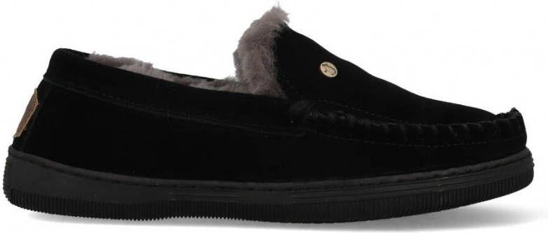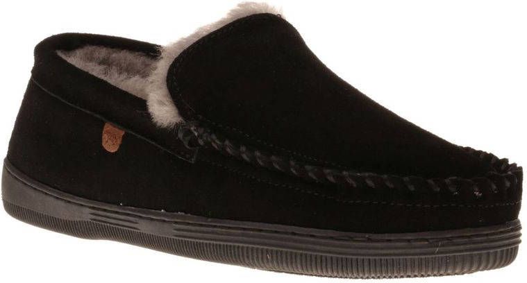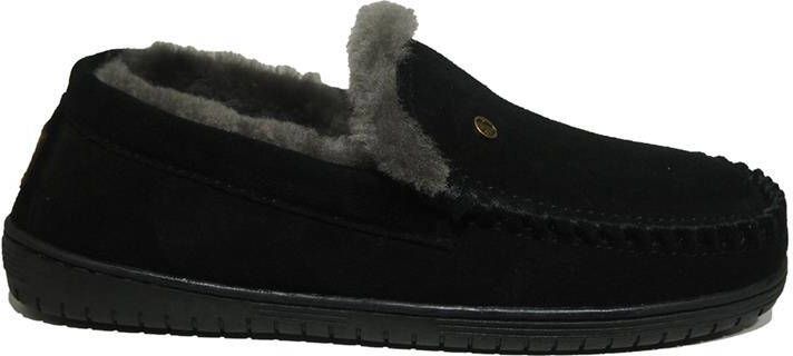 Warmbat moccasin in het zwart voor heren. Deze pantoffels hebben een bovenwerk gemaakt van leer, een warm gevoerde binnenvoering van wol en een kunststof zool.